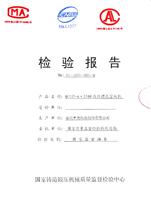 根據2006年第4季度剪板機國家監督抽查實施方案,受國家質量監督檢驗檢疫總局委托,國家鑄造鍛壓機械質量監督檢驗中心,于2006年9月23日,對本公司產中德牌液壓擺式剪板機進行了現場檢驗。近日,我公司收到了本次抽檢的結果通知單及檢驗報告,結果為:合格。