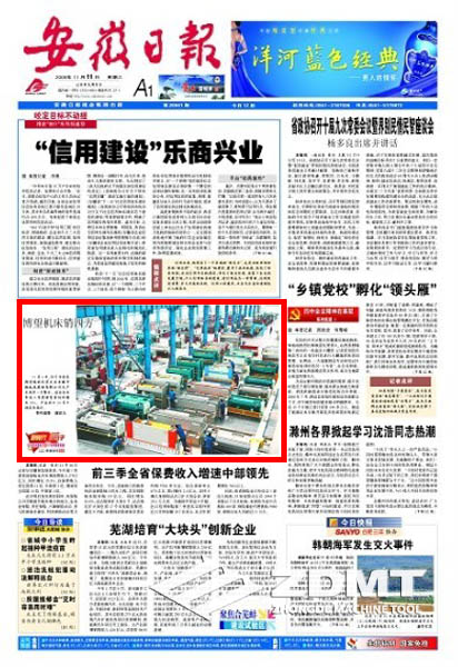 今日(2009年11月11日)《安徽日報》頭版刊載《博望機床銷四方》的圖片新聞報道。在我公司大型車間圖片中,配出如下文字報道:11月6日,位于當涂縣博望鎮(zhèn)的民營企業(yè)安徽中德機床股份有限公司生產(chǎn)車間里一片繁忙。該企業(yè)今年前三季度銷售量同比增長35%,產(chǎn)品出口30多個國家和地區(qū)。(特約攝影 謝富樂)